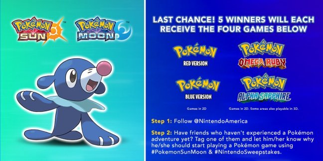 Nintendo’s Pokemon-themed contest is about to wrap up, but there’s still some time left. For a chance to win a Pokemon Sun and Moon prize pack, follow @NintendoAmerica on Twitter and tag one of your friends to let them know why they should start playing a Pokemon game using the hashtags #PokemonSunMoon and #NintendoSweepstakes. The prize pack includes four Pokemon games on Nintendo 3DS – Pokemon Red, Blue, Omega Ruby and Alpha Sapphire. Five winners will be chosen.