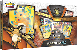The Pokémon TCG: Shining Legends Special Collection—Raichu-GX includes a beautiful full-art foil promo card featuring Raichu-GX itself, plus a full-art oversize card of our star and a foil promo card featuring Pikachu. The collection also includes a coin featuring Raichu and five booster packs from the special Pokémon TCG: Shining Legends expansion!