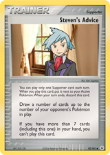 A few expansions later, in EX Power Keepers, Steven’s Advice saw a reprint with a slight change to the restriction: you can’t play the card if you have seven or more cards in your hand (including Steven’s Advice). That makes it just a little harder to play. Either way, Steven’s Advice could prove useful if your opponent’s Bench was full and you needed a fresh hand of cards to help prepare a counterattack.