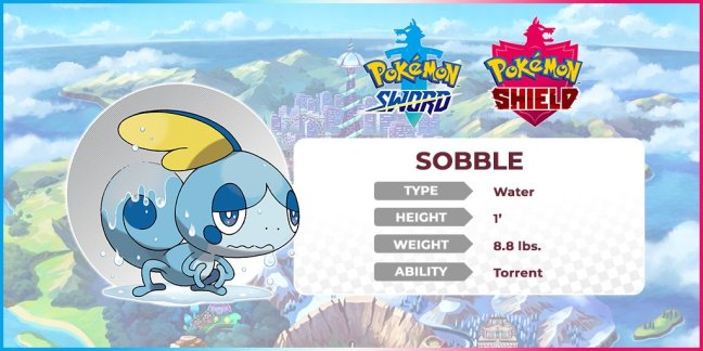 When Sobble touches water, its body changes its pattern and color, allowing it to blend into its surroundings. A rather timid Pokémon, Sobble will secrete the water within its body like sweat and disappear into its surroundings when nervous or embarrassed. With tears that are as potent as a hundred onions, Sobble will start to bawl if it feels threatened, spreading its tears around the area and causing everyone around it to start crying uncontrollably. Sobble will then use this distraction as a chance to escape.