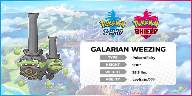 35 thoughts on “Galarian Weezing is a Poison/Fairy-type Pokémon with the Levitate ability in Pokémon Sword and Shield”