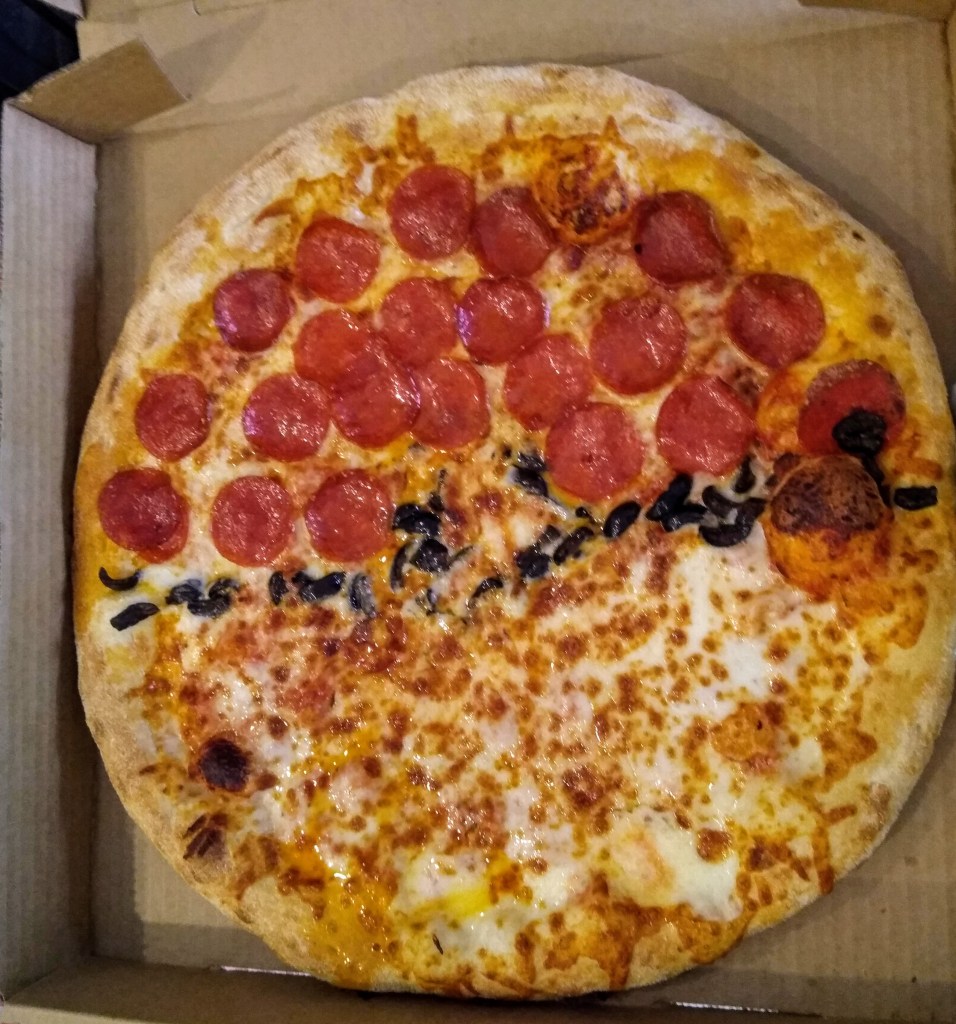 Only an hour earlier, I had called Barrio’s pizza. “Yes, I would like a pizza with just plain cheese on one side, heavy pepperoni on the other, and a line of olives dividing the two.”
