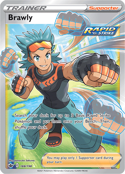 We often like to take a closer look at Pokémon TCG art by a specific artist, and this time we’re focused on Sanosuke Sakuma. We’ve already seen one piece by this artist in the Weedle artwork above. By also looking at Sakuma’s Inkay artwork, we can appreciate the use of bright, bold colors, and the sheer amount of personality that each Pokémon in these cards has been given. But Sakuma is just as comfortable drawing human characters as well as Pokémon. Caitlin, a member of the Unova region Elite Four, may look pensive, but she shares the same bright, cartoony style that we saw in the Pokémon artwork. Brawly, the Gym Leader from the Hoenn region’s Dewford Town, is shown in a more action-packed pose that reflects his love of Fighting-type Pokémon. And you can’t deny the energy and attitude that emanates from Sakuma’s Doctor artwork. She looks like she’ll help you out, but not without a cutting remark about how you should be taking better care of yourself and your Pokémon.