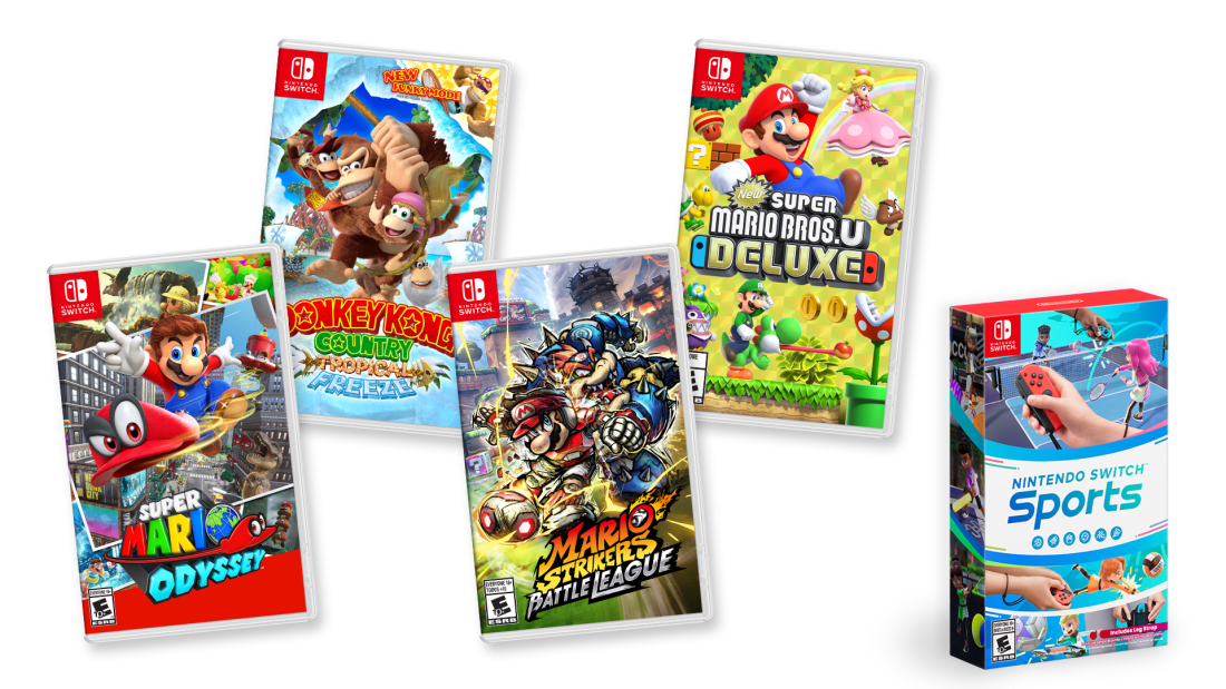 Choose from Nintendo Switch™ Sports, New Super Mario Bros.™ U Deluxe, Super Mario Odyssey™, Donkey Kong Country™: Tropical Freeze, & Mario Strikers™: Battle League.