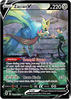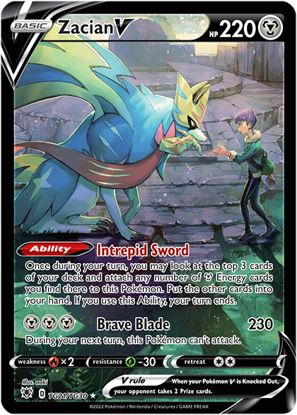 The Legendary Pokémon Zacian made its debut in the Pokémon TCG with Zacian V in the Sword & Shield expansion. Its powerful Brave Blade attack that does 230 damage for 3 Metal Energy ensured that Zacian V quickly became one of the strongest Pokémon in the game and the primary partner of the popular Arceus & Dialga & Palkia-GX. This artwork featuring Zacian V was released in Sword & Shield—Astral Radiance’s Trainer Gallery, and it depicts Hop and Zacian partnering up deep in the Slumbering Weald following the post-game events of Pokémon Sword and Pokémon Shield.