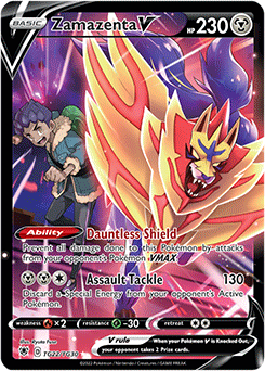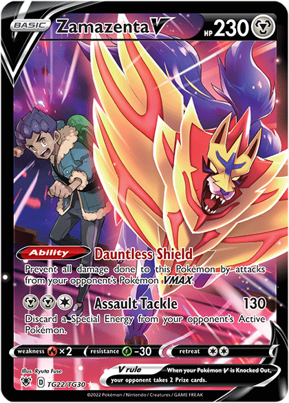 Flashy attacks are usually the name of the game for Pokémon TCG cards, but Zamazenta V bucked the trend with the Dauntless Shield Ability. Thanks to that, Zamazenta V was able to stall towering Pokémon VMAX and maybe also knock off a Special Energy or two with Assault Tackle. This rendition of Zamazenta V was released in Sword & Shield—Astral Radiance’s Trainer Gallery and features Hop and Zamazenta charging into battle together at the top of Hammerlocke’s Energy Plant.