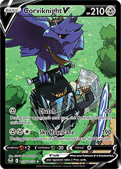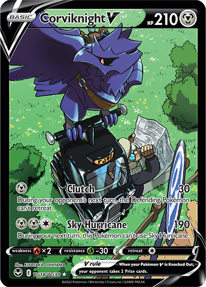 Flying Taxis are everywhere in Galar, and they’re always carried by the Raven Pokémon, Corviknight. Featured in the latest Pokémon TCG set, Sword & Shield—Silver Tempest’s Trainer Gallery, a cabbie and their Corviknight take a break from transporting customers across Galar. The size of Corviknight in relation to the cab is highlighted in this artwork that conveys moment of calm in a busy day for both characters.