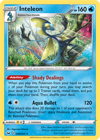 Here, Inteleon gracefully poses in the forest above what appears to be a small pond. Light shines behind it, accentuating its stature and highlighting its water-shooting fingertips. Inteleon, the Secret Agent Pokémon, is famous for its Shady Dealings Ability. The capability to search any Trainer card out of the deck is a powerful tool to have; the fact that Inteleon searches out 2 Trainer cards made it one of the most powerful support Pokémon during the Sword & Shield era of the Pokémon TCG.