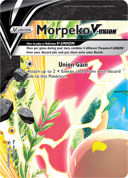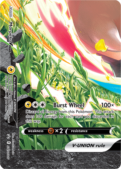 Morpeko may be the “hangriest” Pokémon discovered in the Galar region, but in this artwork by Mitsuhiro Arita, it appears to be well-fed and all smiles. Only a few Pokémon V-UNION were released during the Sword & Shield era; Morpeko received the honor of being featured in an illustration that spans multiple cards. When the four cards are united, Morpeko can be seen jovially charging up its signature attack.