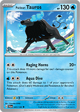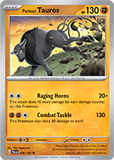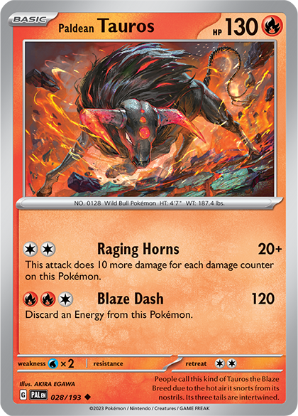 Now that the Pokémon TCG has entered the Paldea region, we’re obviously going to see more Paldean Pokémon, including regional variants of familiar Pokémon from other regions. Such is the case with Tauros. Originally discovered in the Kanto region, the Wild Bull Pokémon has three new breeds to be found in Paldea (and in this expansion!). This Fire-type Paldean Tauros is a Blaze Breed, and judging by its artwork, this is not a Pokémon to mess with. What’s more dangerous here: those pointy horns or the swirling flames? The Water-type Paldean Tauros is an Aqua Breed. It may not look as immediately terrifying, but that solid, wide stance and aggressive snort it’s giving makes it clear that it’s not a Pokémon to be trifled with. Finally, the Combat Breed, a Fighting-type Paldean Tauros, lives up to its name with a fearsome kick that decimates solid rock.