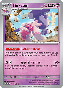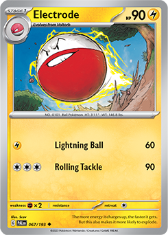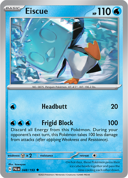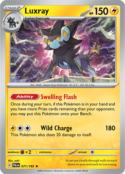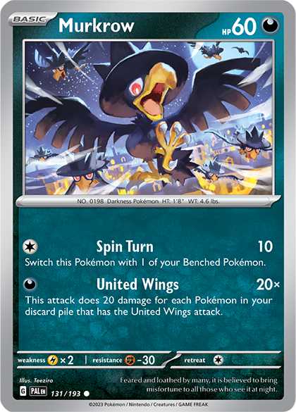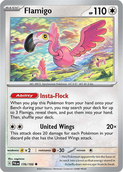 It’s always fun to see Pokémon TCG cards that feature multiple Pokémon in their artwork, and Scarlet & Violet—Paldea Evolved does not disappoint on that front. Wattrel has an attack called United Wings, which does more damage based on how many Pokémon in your discard pile have that same attack, so it’s only fitting that its card shows multiple Wattrel taking to the air. Multiple Murkrow can also be seen soaring over a city on its card, although we’re not sure if the lead Murkrow has been startled by the viewer or if it’s merely putting on a display for us. (And wait… does this card have the United Wings attack as well?) The Flamigo card is a sharp contrast to Murkrow—billowy clouds colorfully reflecting the sunlight, and these Pokémon appear far more serene. Flamigo’s Insta-Flock Ability, which lets you bring more Flamigo from your deck into your hand, ties into the theme, too. (Hold up… this card has the United Wings attack, too? We’re detecting a theme!)