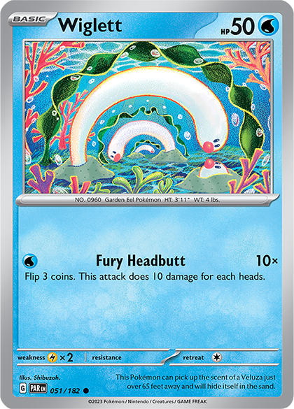 It’s important to have a flexible strategy when battling in the world of Pokémon, but these Pokémon take that advice to the extreme by being extremely flexible themselves! Toedscool (illus. Tomokazu Komiya) is stepping out on its long tentacle-like legs that, quite frankly, hardly look capable of supporting the Pokémon’s 72.8 pounds. Given that they can, however, we wouldn’t want to be on the receiving end of a kick from one of those limber limbs. Wiglett (illus. Shibuzoh.) shows off its pliable nature by turning its entire body into an arch. Seeing a group of these Pokémon amid similarly shaped underwater plants makes for a very charming scene.