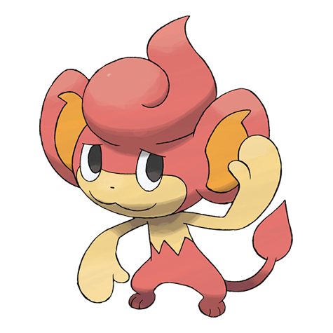 Pansear is a simian, red-and-cream Pokémon. Its head is red with a whorled tuft on top. The tuft contains a flame, and can reach temperatures of 600 °F (300 °C). Pansear has oval eyes, a tiny nose, and large ears with orange insides. Its muzzle, upper body, and skinny forelimbs are cream-colored, and its hands seem to have no fingers, aside from a thumb. Pansear’s lower body is red with small feet, and its long tail has an arrowhead-shaped tip. Pansear makes its habitat in both forests and volcanic caves, and has been known to roast berries before eating them.”–Bulbapedia.