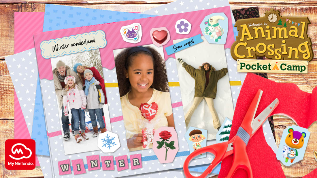 Delight in winter memories with your friends from the Animal Crossing: Pocket Camp mobile game***! You can create a personal scrapbook page to fill with campers and items from the game!