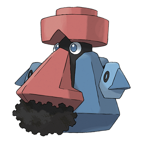 Probopass is a mostly blue, rock-like Pokémon. It has small round eyes, a red nose that is large in proportion to its body, and a bushy black mustache that consists of iron sand, which appears to be attracted by its magnetic nose. Probopass has three small objects on its sides and back, called Mini-Noses (Japanese: チビノーズ Chibinose), which it is able to control. It has a big red hat-like magnet on top of its head, and exudes strong magnetism from all over its body.