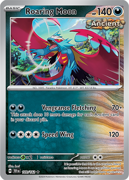 It’s a new dawn for Ancient Pokémon, and Roaring Moon leads the charge. Roaring Moon’s Vengeance Fletching attack does 70 damage to the opponent’s Active Pokémon, plus 10 more damage for each Ancient card in your discard pile. To keep tempo with Pokémon ex and Pokémon V, a deck focused on Roaring Moon needs to include loads of Ancient cards and ways to quickly discard them. The new Explorer’s Guidance is an Ancient Supporter card that digs up and discards resources, as does Earthen Vessel. The new Awakening Drum ACE SPEC card helps draw them from the deck, and they also have synergy with Professor Sada’s Vitality, which attaches Basic Energy cards from the discard pile to Pokémon in play.