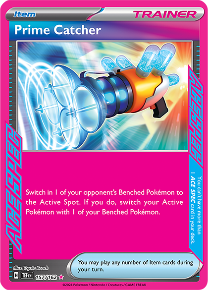 Unlike Counter Catcher, Prime Catcher can be used at any time in the game, but the Trainer who plays it must also switch their Active Pokémon with a Pokémon on their Bench. This helps Pokémon like Radiant Charizard and Miraidon ex to attack on consecutive turns. It could also create problems if a Pokémon is forced into the Active Spot when they are not ready to contribute to the battle. Don’t be caught unaware!