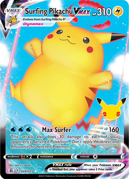 It would be five years before Surfing Pikachu returned to the Pokémon TCG, but it certainly made a splash in 2021’s Celebrations expansion, where it appeared as both a Pokémon V and Pokémon VMAX illustrated by aky CG Works. Surfing Pikachu V may still only know Surf, but the attack now hits for a more impressive 150 damage. The Dynamaxed Surfing Pikachu VMAX may appear to be struggling to balance on its comparatively tiny surfboard, but that won’t stop it from unleashing its Max Surfer attack. This move not only does 160 damage to your opponent’s Active Pokémon, but it also inflicts 30 damage on all their Benched Pokémon. Way to harsh their mellow, Surfing Pikachu VMAX!