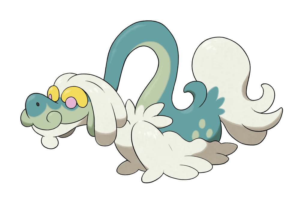 Drampa is a serpentine Pokémon similar to a Chinese dragon. Most of its skin is bluish-green, but the lower half of its face and the underside of its neck is a pale green. There are three spots on each of its sides that are also light green. It has pink eyes with rounded, yellow eyebrows, short whiskers resembling a mustache, floppy ears, and a small, white beard with a circular extension. On top of its head is a mop of white hair split into four rounded sections: two draped down either side of its head. Fluffy white fur drapes the lower half of its body and conceals its arms when they are tucked against its chest. When its arms are spread, two short claws are revealed on each hand. It has a bushy white tail with a small, curved spike at the base.