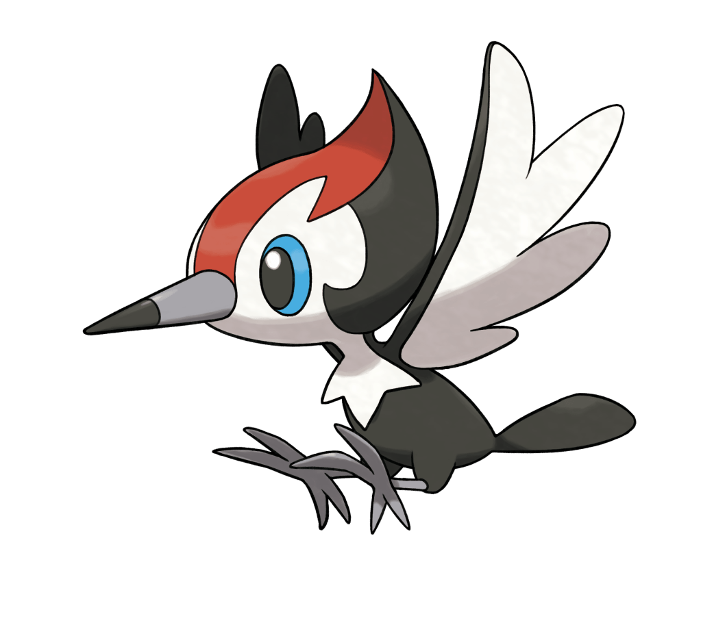 Despite its slender appearance, Pikipek has powerful neck muscles and is able to strike 16 times per second with its beak. Pikipek does not feel pain when using its neck muscles. This allows it to not only drill through wood, but shatter stone as well. The holes it drills in trees are used for nesting, storing food, and collecting small, glittering objects. The noise of this Pokémon pecking can be used to communicate with others. This Pokémon feeds on Berries and is able to attack opponents by zipping the leftover seeds at them. These shots have enough force to embed the seeds in trees. Talonflame is a natural predator of Pikipek, while Pikipek itself preys on Metapod. It generally lives in humid forests.“-Bulbapedia.