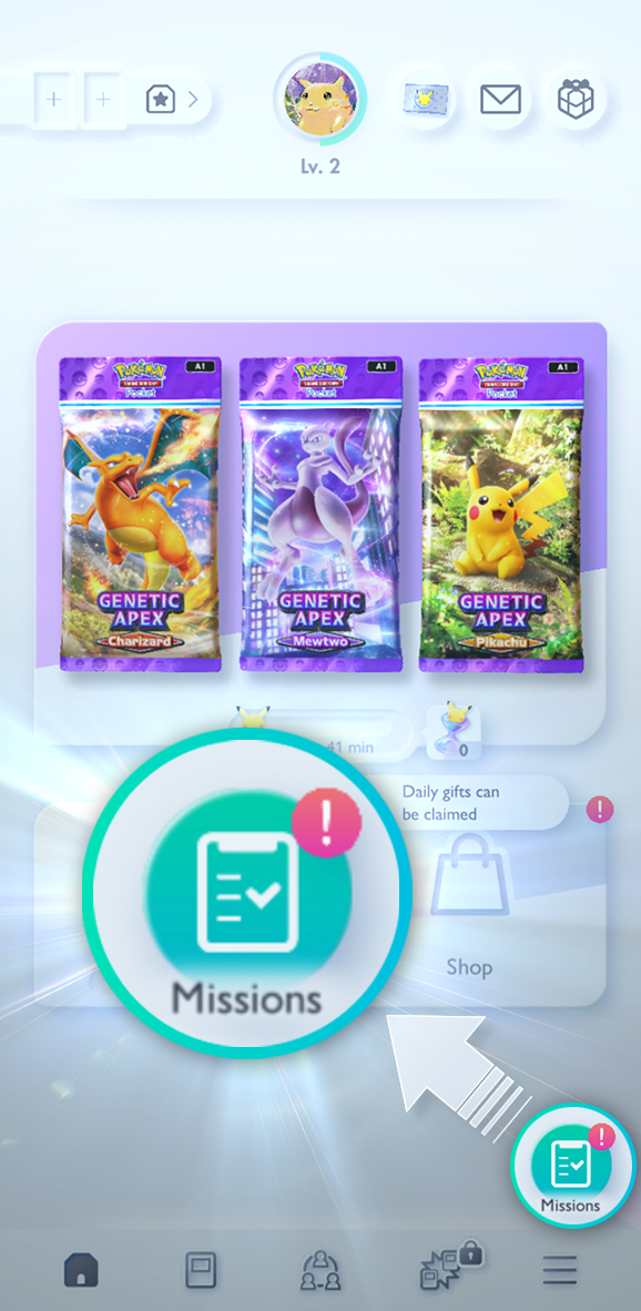 To help you open enough booster packs to reach level 3, you should keep an eye on the Missions tab. Here, you’ll find various objectives related to the number of cards in your collection, the amount of booster packs you’ve opened, and much more. Many missions can be quickly completed on a brand-new account and will award pack hourglasses, which you can use to refill your stamina bar. Doing that will allow you to open even more booster packs and keep the experience coming.