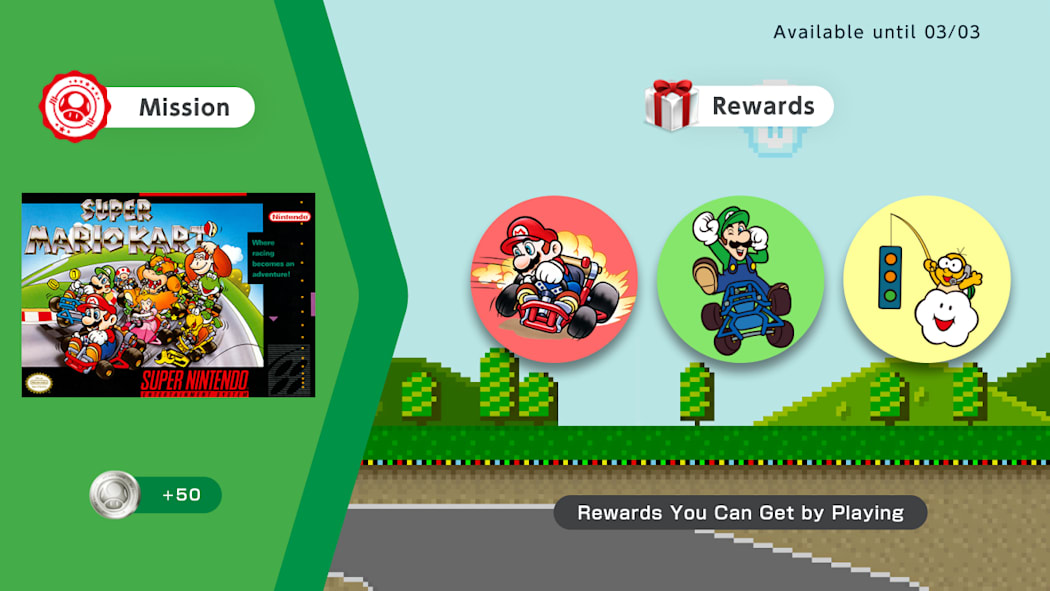 Earn My Nintendo™ Platinum Points** for playing the Super Mario Kart™ game from the Super NES – Nintendo Switch Online collection. You’ll then be able to redeem your points for icon elements inspired by the game, which you can use to create a speedy new look for your user icon on your Nintendo Switch™ system.