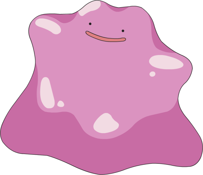 In its natural state, Ditto is a light-purple or pink blob-like Pokémon with vestigial facial features. It is often referred to as amorphous, but has a relatively consistent appearance in official artwork, including two small nubs on its “head”, a few soft lumps at its base, and two pseudopod-like protrusions in place of arms. The face consists of beady eyes and a simple mouth; almost always pulled into a smile.