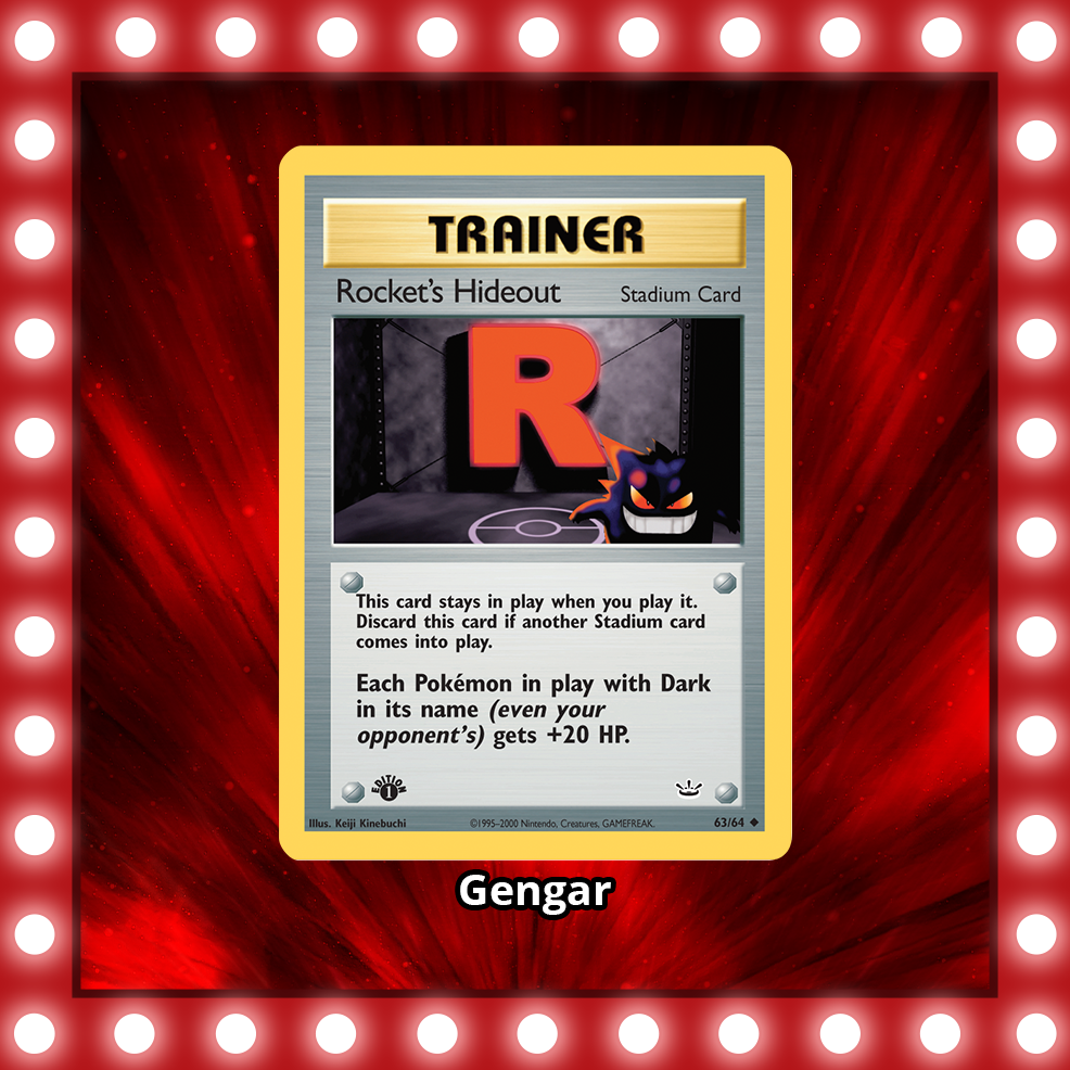- What Pokémon appears on the original Rocket’s Hideout Stadium card from the 2001 Neo Revelation expansion?