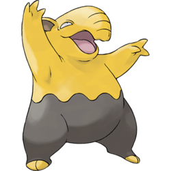 Drowzee is a bipedal Pokémon that resembles a tapir. It has tired-looking eyes, a short trunk above its mouth, and triangular ears with brown interiors. The upper half of Drowzee’s body is yellow and the lower half is brown. A wavy line separates the two halves. It has a round belly and short legs. Its feet are brown, except for its two toes, which are yellow. The bottom of each foot has a small, round, pink pad in the middle of it. There are three fingers on each of its hands. Drowzee is believed to have a common ancestor with Munna and Musharna.