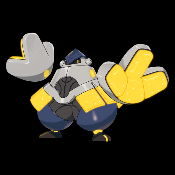 Iron Hands is a large, bulky cyborg Pokémon that looks like a futuristic sumo wrestler. The head crest is a deep blue with ten black lines connecting across it. The head is light grey with cylinder-like ears. The two eyes are yellow within a black faceplate. The upper half of their body is colored light gray resembling a light armor gear with two bright yellow holes with white spots on each side of where the shoulder would be. Also connected to it is a grey belt with three yellow square armor-like pieces on each side with white spots as well. The lower half is grey with several black line markings. The half-sphere legs are colored dark blue which are connected to small yellow rectangles with white spots. The black feet are shaped like shoes with one small, yellow rectangle with white spots connected to each foot. It has two giant, three-fingered hands which it uses. The back side of their hands is light grey with a yellow circle in the center with three white spots each. The front is four large, bright yellow rectangles connected and black lines. The rectangles also have several white spots as well.