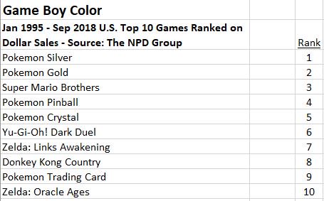 The NPD Group analyst Mat Piscatella recently unveiled the best-selling games on the consoles of the mid to late 90s in the U.S. To no one's surprise, the top Game Boy Color games include several Pokémon titles, including Pokémon Silver, Pokémon Gold, Pokémon Pinball, Pokémon Crystal and Pokémon Trading Card Game. On Nintendo 64, Pokémon … Continue reading Pokémon Silver, Gold, Pinball, Crystal, Trading Card Game, Stadium and Super Smash Bros. among the best-selling games of all time on Game Boy Color and Nintendo 64