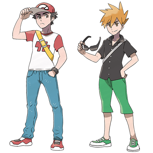 Official artwork of Kanto Trainers Red and Blue, who also appear in Pokemon Sun and Moon