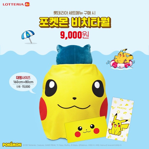 Pikachu beach towel and Pokémon zipper bag now available at Lotteria in South Korea