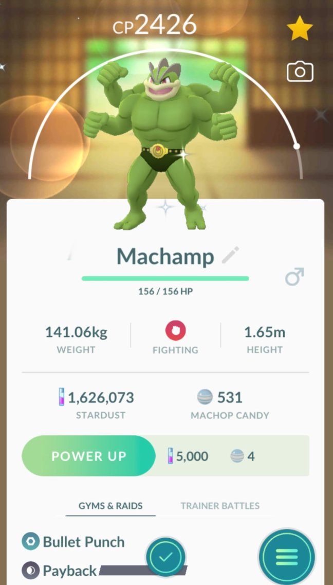 Pokémon GO screenshot of Machamp with the Pokémon GO Community Day exclusive move Payback