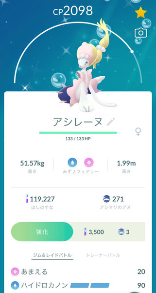 Pokémon GO screenshot of Shiny Primarina that knows the Pokémon GO Community Day exclusive move Hydro Cannon