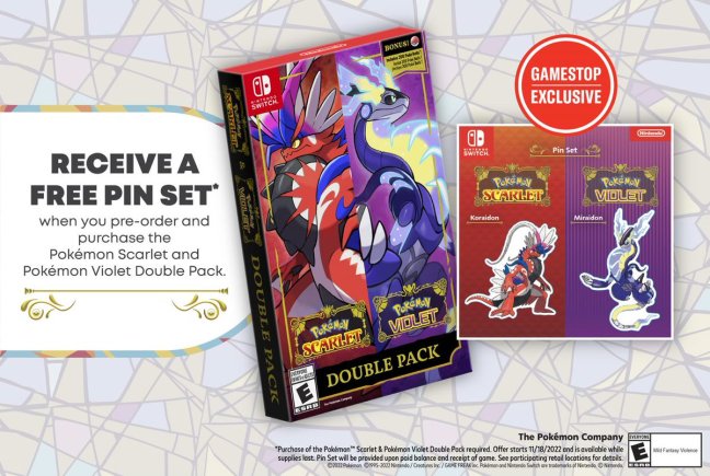 You can now pre-order and purchase the Pokémon Scarlet and Pokémon Violet double pack at GameStop to receive an exclusive pin set featuring Koraidon and Miraidon for free