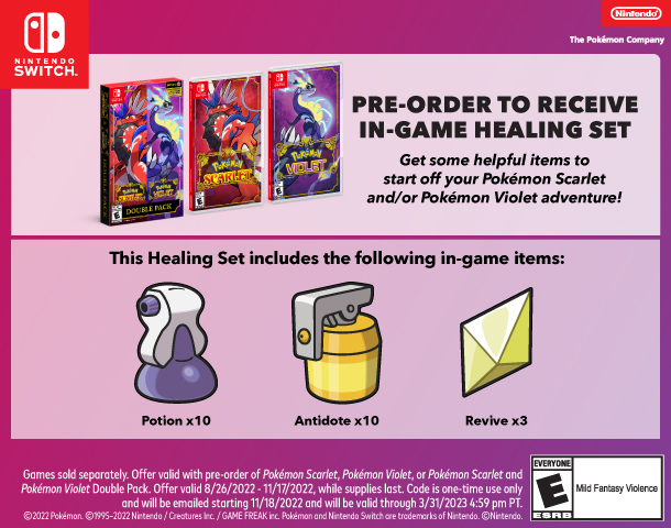 You can now pre-order Pokémon Scarlet, Pokémon Violet, or Pokémon Scarlet and Pokémon Violet Double Pack from Amazon to receive a download code for an exclusive in-game Healing Set that includes 10 Potions, 10 Antidotes and three Revives