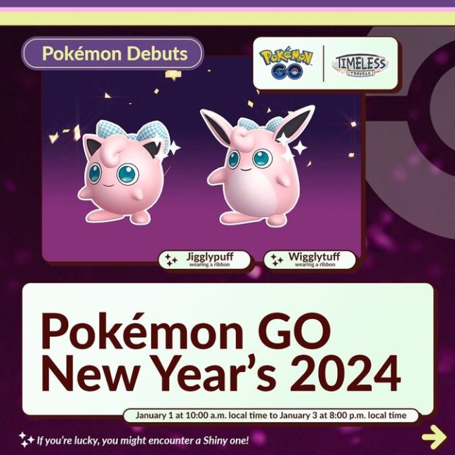 Niantic is continuing to announce new events and content for Pokémon GO. Read on below to learn more: Celebrate the start of 2024 with a grand event! Celebrate the start of the year with our New Year’s event! Keep an eye out for costumed Pokémon making their debuts, new avatar items, and the return of … Continue reading Pokémon GO New Year’s 2024 event now underway in the Asia-Pacific region until January 3 at 8 p.m. local time, Jigglypuff, Shiny Jigglypuff, Wigglytuff and Shiny Wigglytuff wearing ribbons now available for the first time